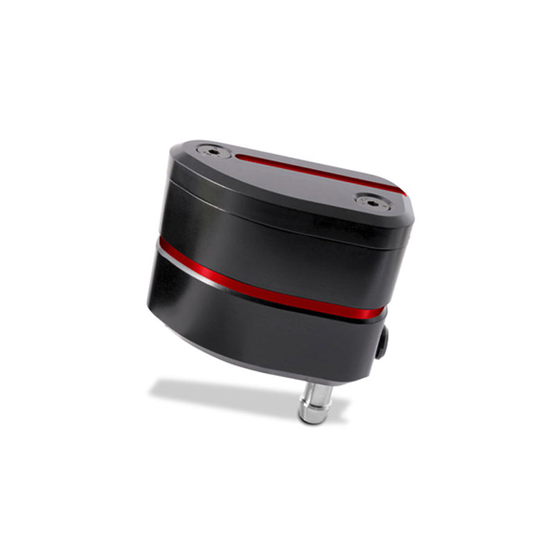 Serbatoio olio freno interamente realizzato in lega di alluminio lavorata con centri di lavoro CNC per garantire la massima qualità. Progettato su un design personalizzato VMC viene proposto nero con inserti colorati. Sul lato è presente la finestra per il controllo del livello dell'olio. Il serbatoio è dotato di due possibilità di uscita del tubo dell'olio, una laterale ed una inferiore. Il coperchio, anch'esso realizzato in alluminio, è come il corpo nero con inserti colorati. Prodotto compatibile con tutte le pompe freno con serbatoio esterno.