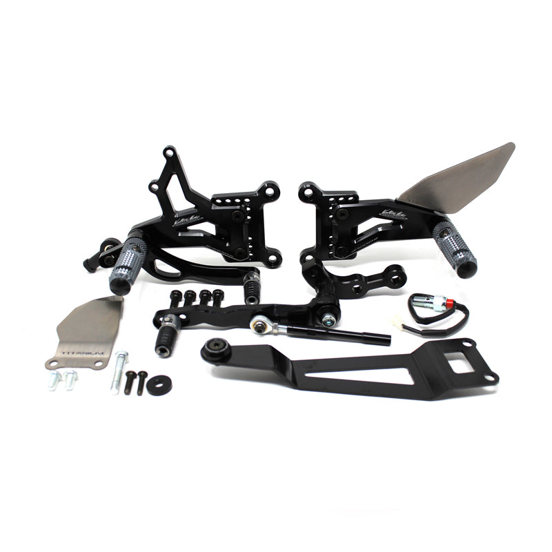 Le pedane regolabili Tipo 3.5 sono il modello di punta della gamma VMC e vengono utilizzate da molti piloti in campionati nazionali e mondiali. Vengono interamente realizzate in Ergal 7075 T5 lavorato su centri di lavoro CNC e sono consigliate prevalentemente per uso pista. I poggiapiedi sono lavorati per offrire il massimo grip, sono reclinabili ma possono essere bloccati tramite un sistema a vite e sono dotati di semisfera protettiva in nylon come previsto dai regolamenti. I puntalini in alluminio sono ricoperti in gomma antiscivolo e reclinabili con ritorno a molla. Le leve cambio e freno sono lavorate per essere allegerite e sono entrambe montate su 2 cuscinetti a sfera per ridurre al minimo l'attrito. Sia per la leva cambio che per la leva freno è stato adottato un sistema a slitta che permette la regolazione longitudinale della posizione del puntalino di 10 mm.Le piastre regolabili permettono da 6 a 9 posizioni posizioni diverse delle pedane consentendo di trovare il miglior set-up per il proprio stile di guida. Il kit comprende le alette paratacco in titanio, tutta la viteria necessaria per il montaggio, l'asta cambio della corretta lunghezza, gli snodi sferici lato cambio e lato freno e l'interruttore a pressione per la luce stop. Per le pedane VMC sono sempre disponibili tutti i ricambi. Pedana con cambio rovesciato per uso pista. Colore Nero/Titanio
